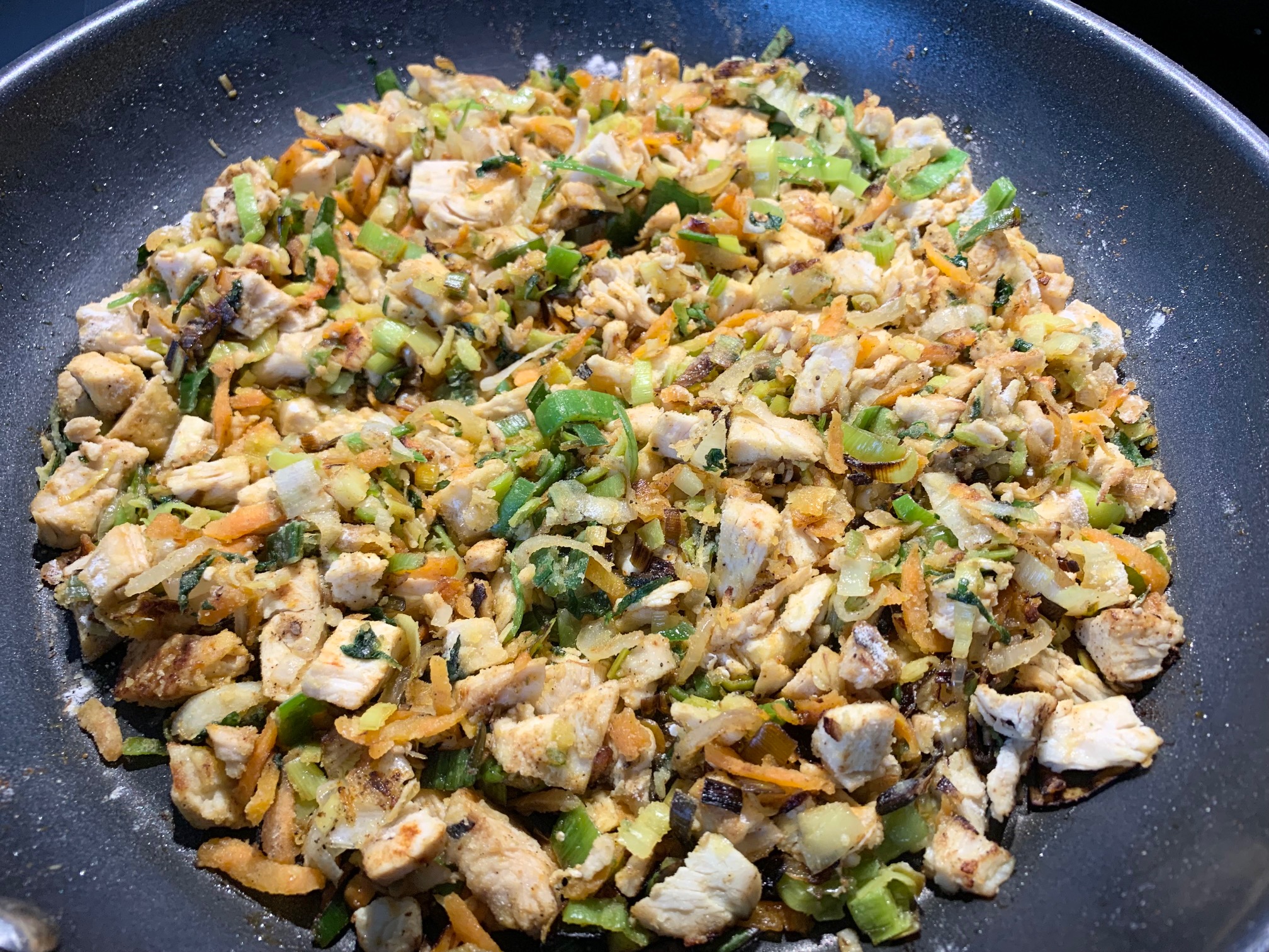 Das Hähnchen dazugeben und für eine weitere Minute unter Rühren anbraten.