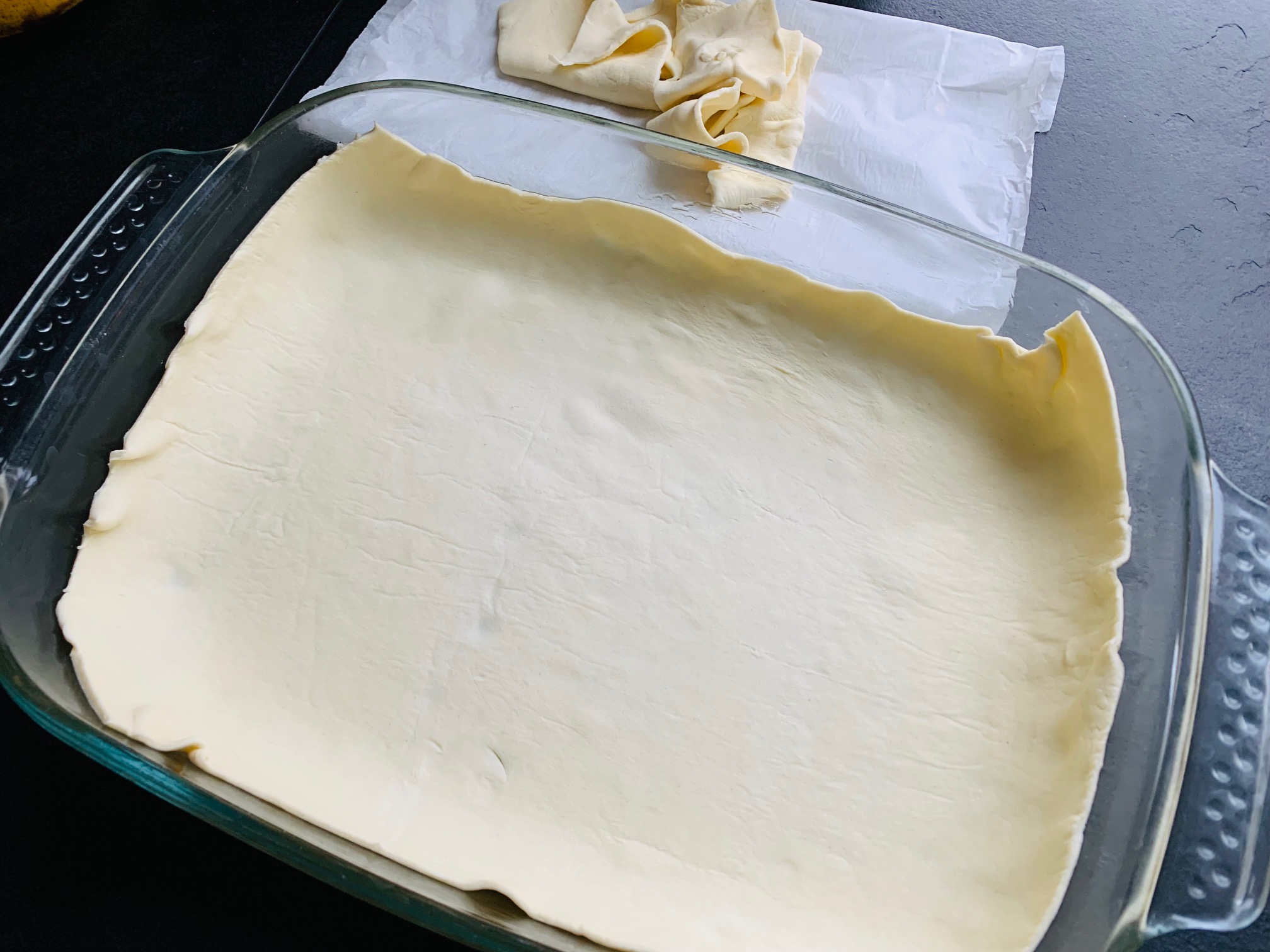 Den 1. Blätterteig in eine passende gefettete Auflaufform auslegen und die Ränder etwas hochziehen. Wenn der Blätterteig zu sehr über die Auflaufform hängt, dann diesen zurechtschneiden und anderweitig verwenden. Zum Beispiel ausrollen und Taschen mit Käse, Frischkäse oder Fetakäse machen.