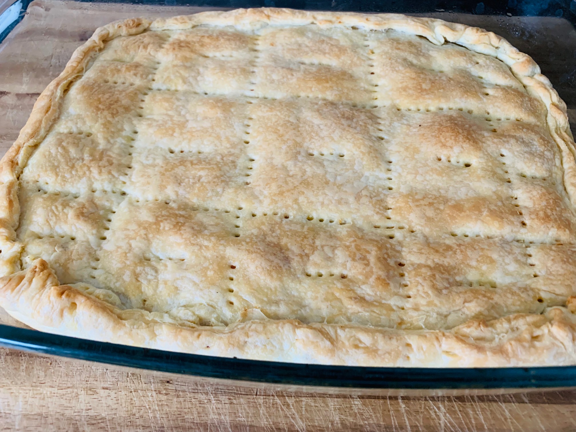 Im Backofen bei 180 Grad Umluft auf dem mittleren Grill ca. 40 Minuten backen, eventuell paar Minuten länger, bis die Kotopita eine schöne Farbe angenommen hat.
