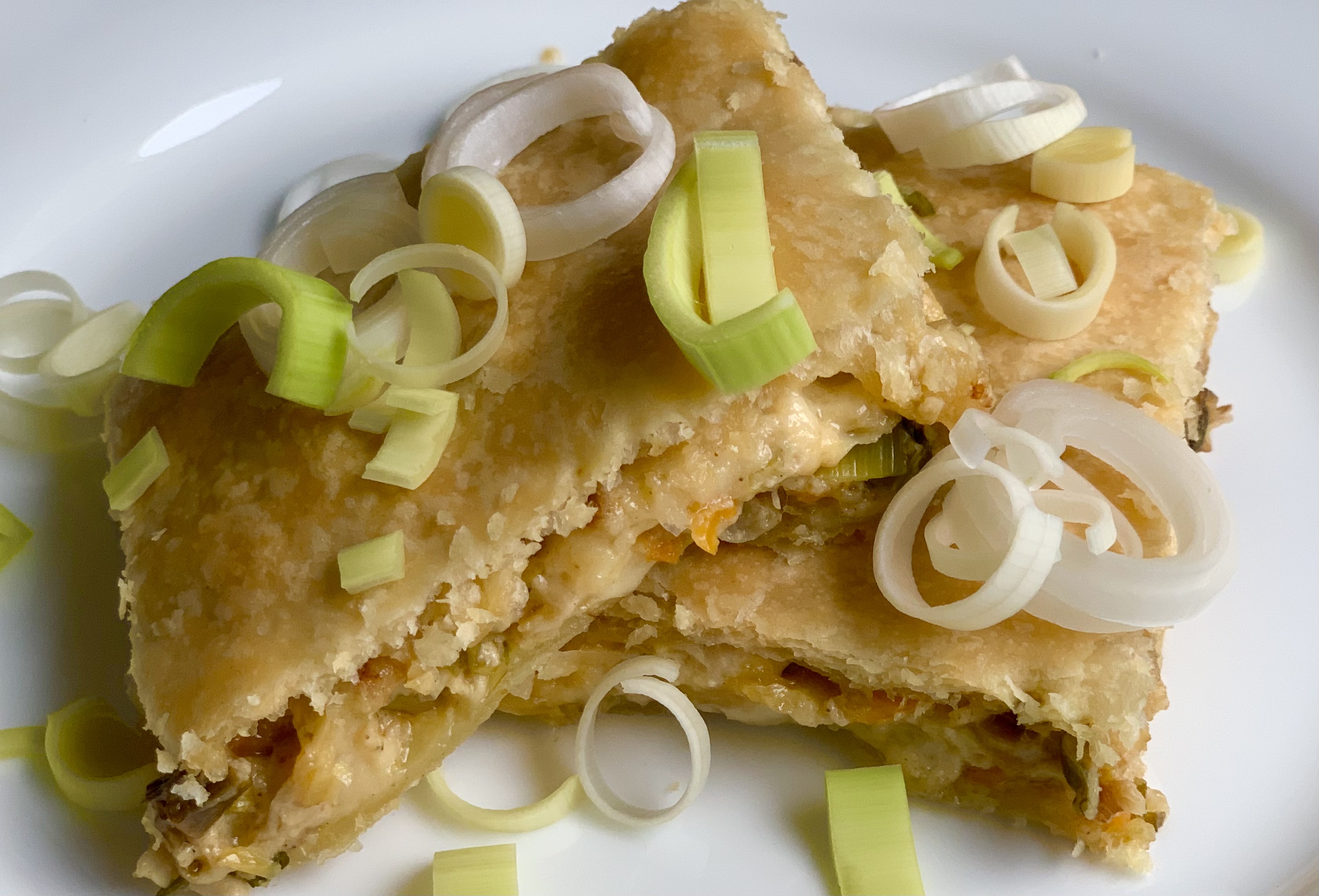 Mit dem zweiten Blätterteig zudecken. Diesen auch zurechtschneiden, dass er als Deckel die Füllung genau zudeckt. Die Ränder vom unteren Blätterteig darüber klappen und mit den Fingern zusammendrücken.