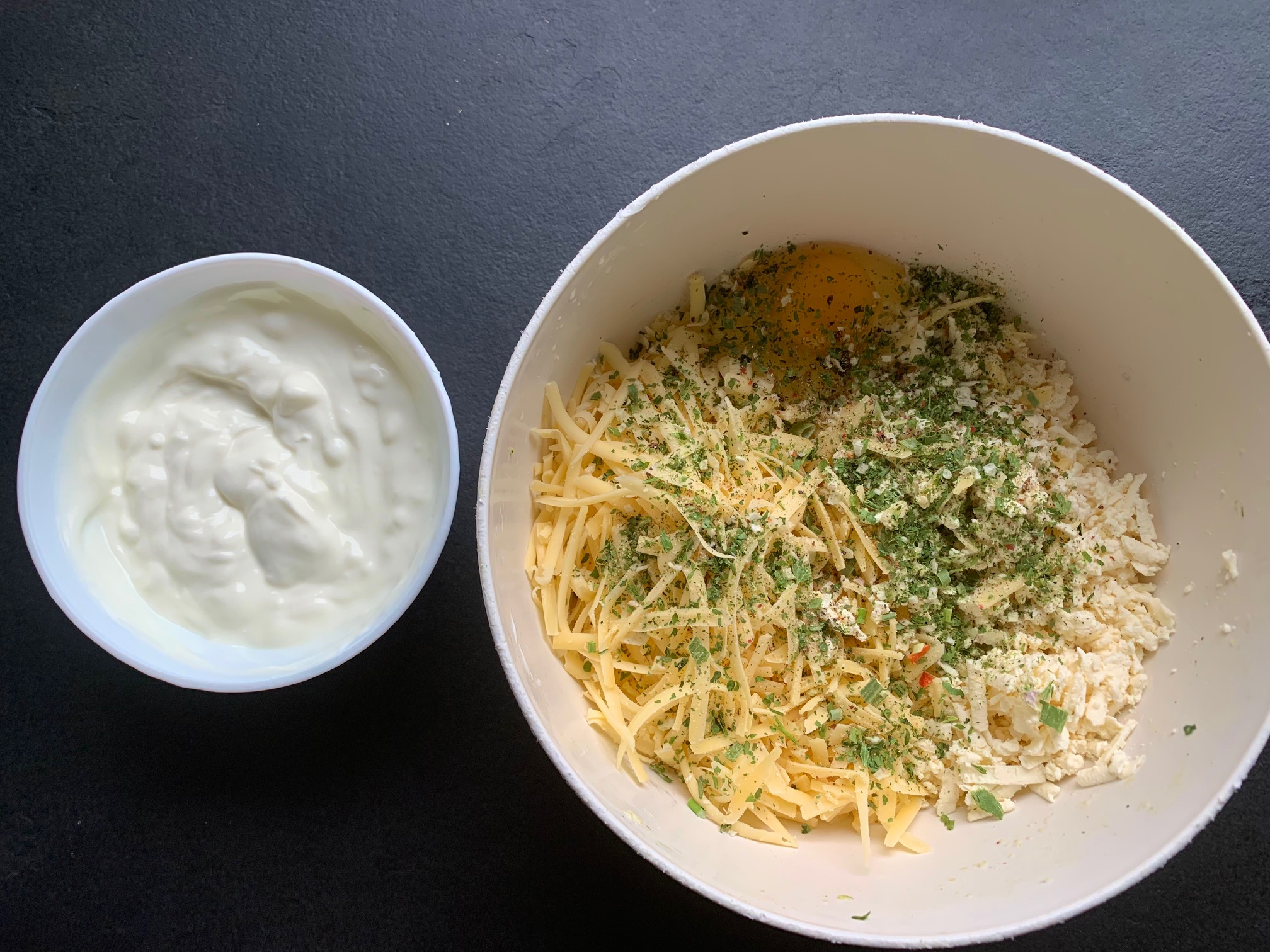 Das Ei, die Kräuter und die Gewürze in die Schüssel dazugeben.