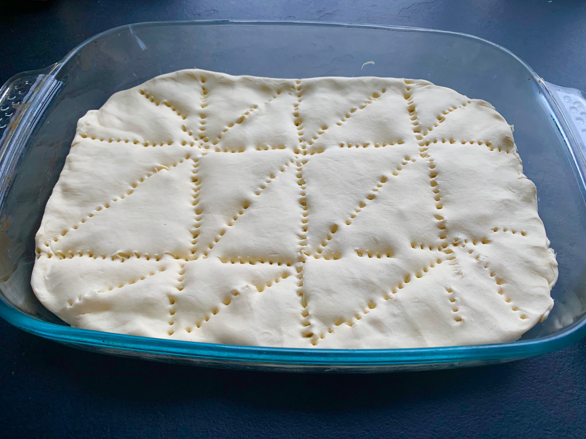 Ein paar “Luftlöcher” mit der Gabel in den Blätterteig stechen.