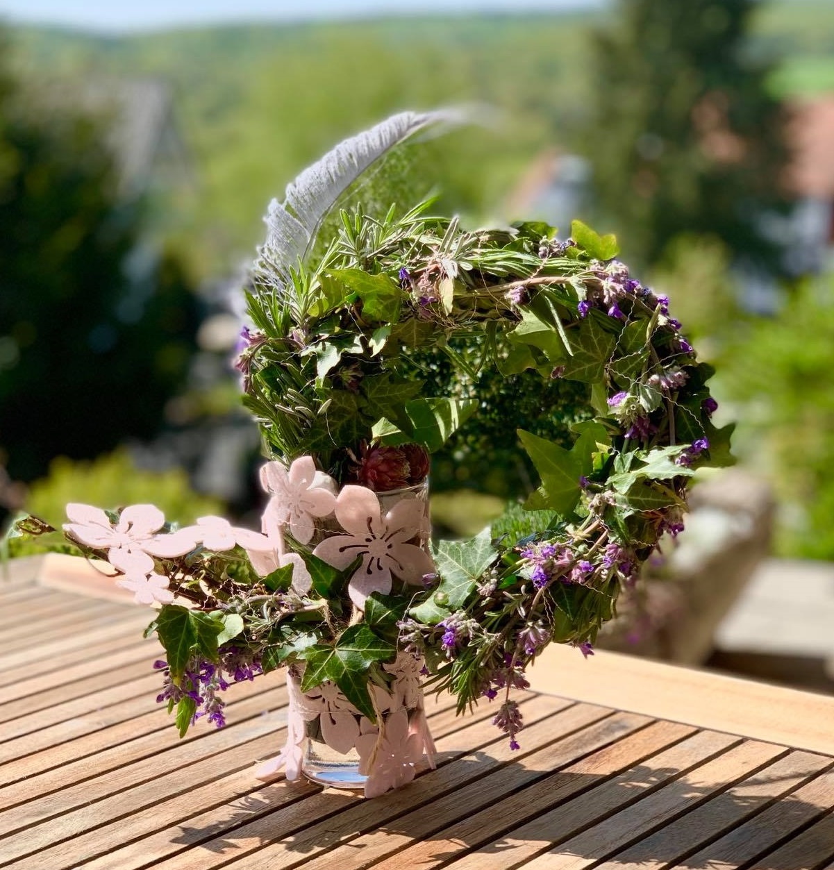 Einige Efeuranken, Katzenminze-Blüten, Lavendelästchen, Floristendraht und Silberdraht, Bindeschnur, ein Stück Blumenband aus Filz ca. 80 cm lang, eine Feder, Steckmoos, ein hohes Glas, und auch ein paar kleine weise Steine und 2-3 Sukkulenten (s. Bild)