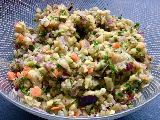 Eine halbe Aubergine plus das Fleisch der ausgehöhten Auberginenhälfte, 3 mittelgroße Kartoffeln, die Zucchini, die Möhre und die Zwiebeln grob reiben, oder im Mixer kleinschneiden.