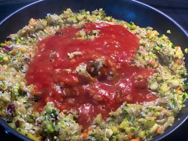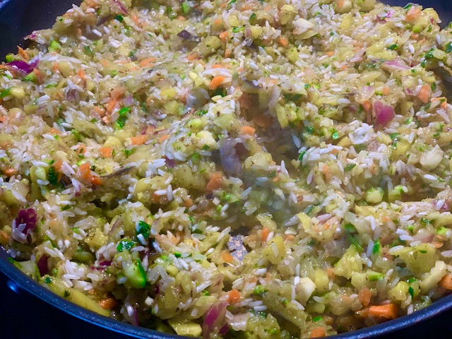 Den Reis dazugeben und eine weitere Minute anbraten.