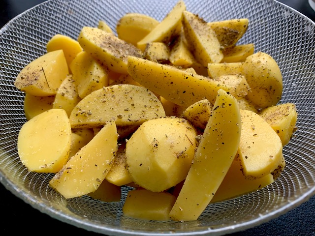 Die Kartoffelspalten salzen und Pfeffern und ebenfalls aufs Blech geben.