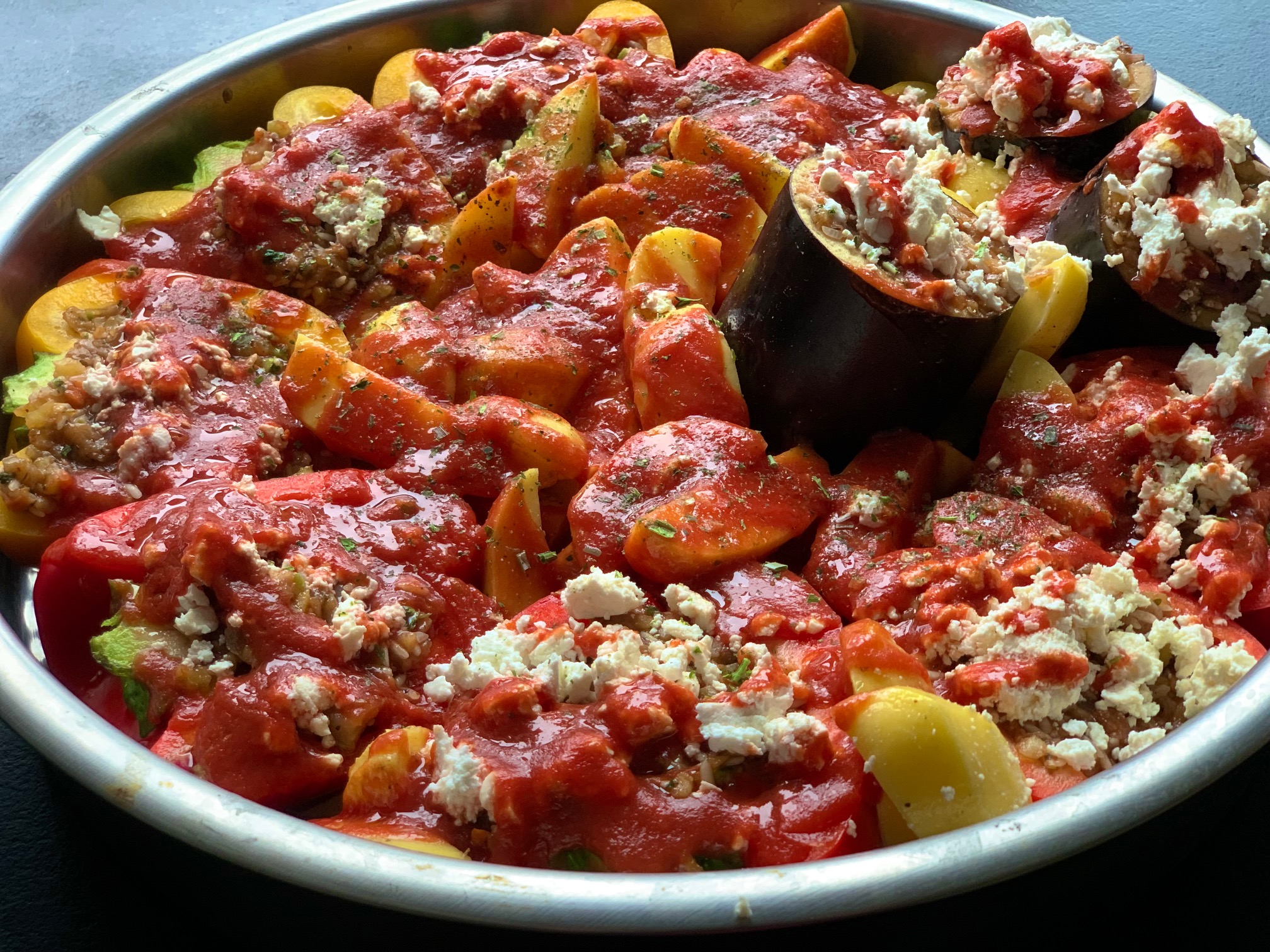 Den Fetakäse über die gefüllten Paprikas und Auberginen streuen. (Tipp: Besser den Fetakäse erst nach dem Backen drüberstreuen, dann wird er beim Backen nicht braun.)