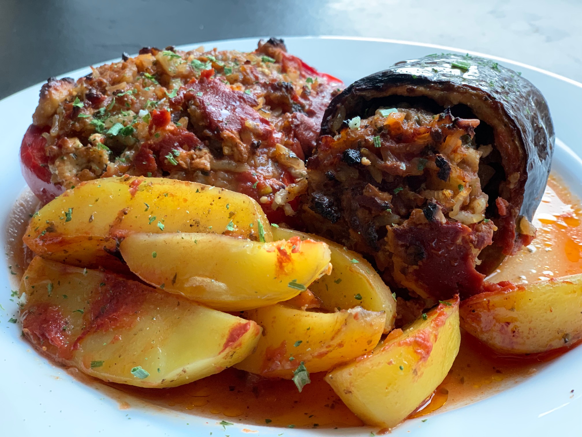 Gefüllte Paprikas und Auberginen mit Kartoffelspalten im Backofen