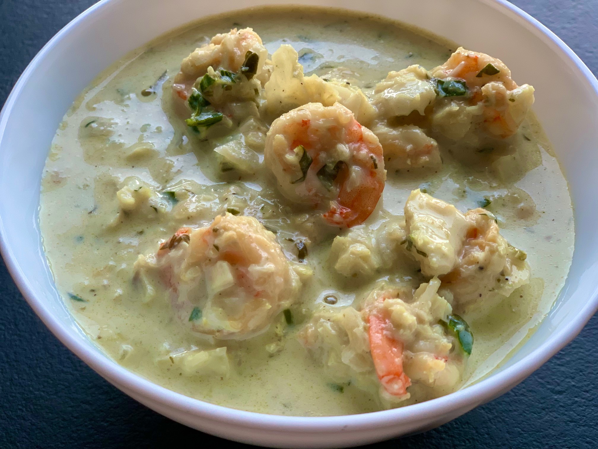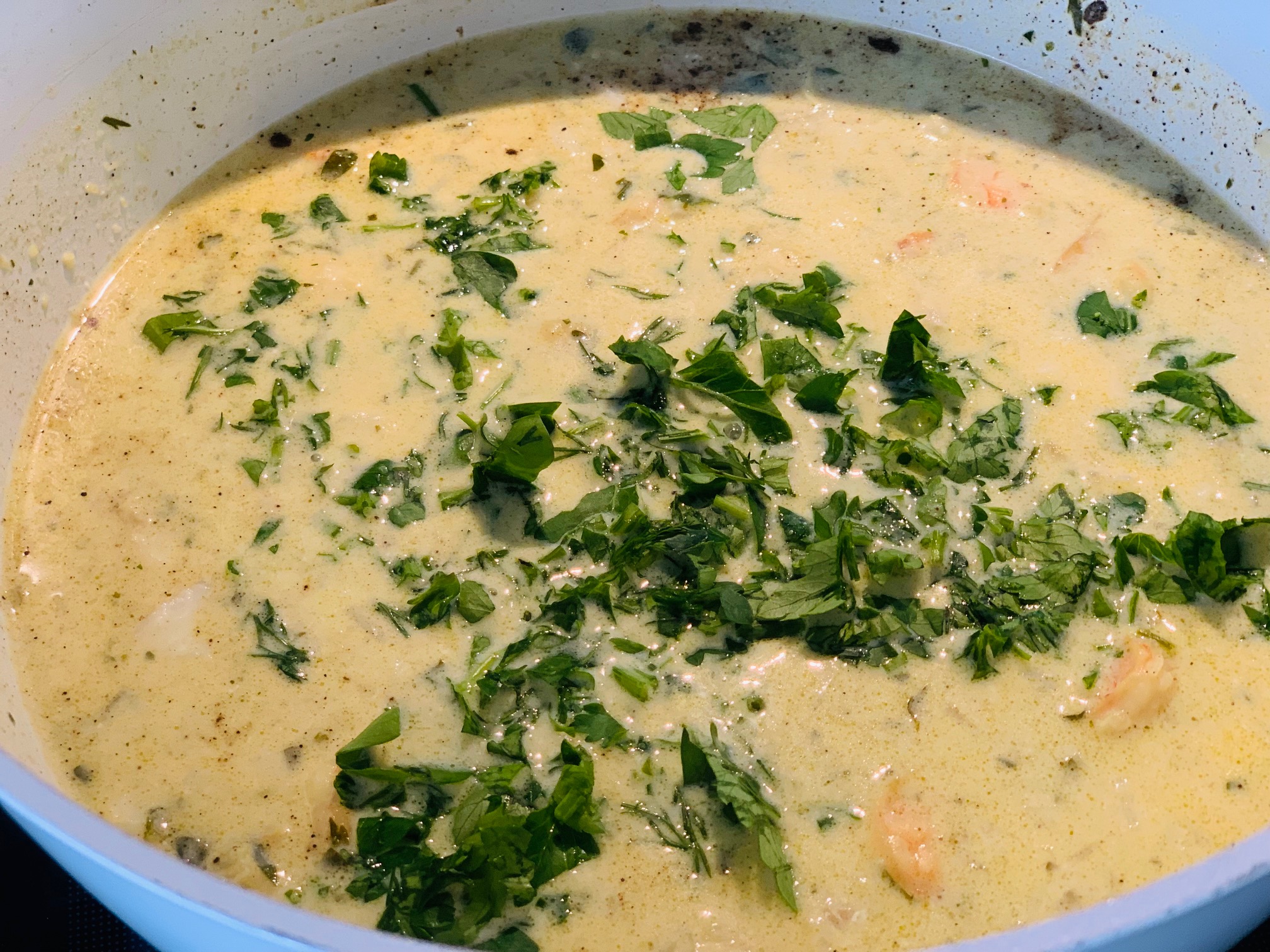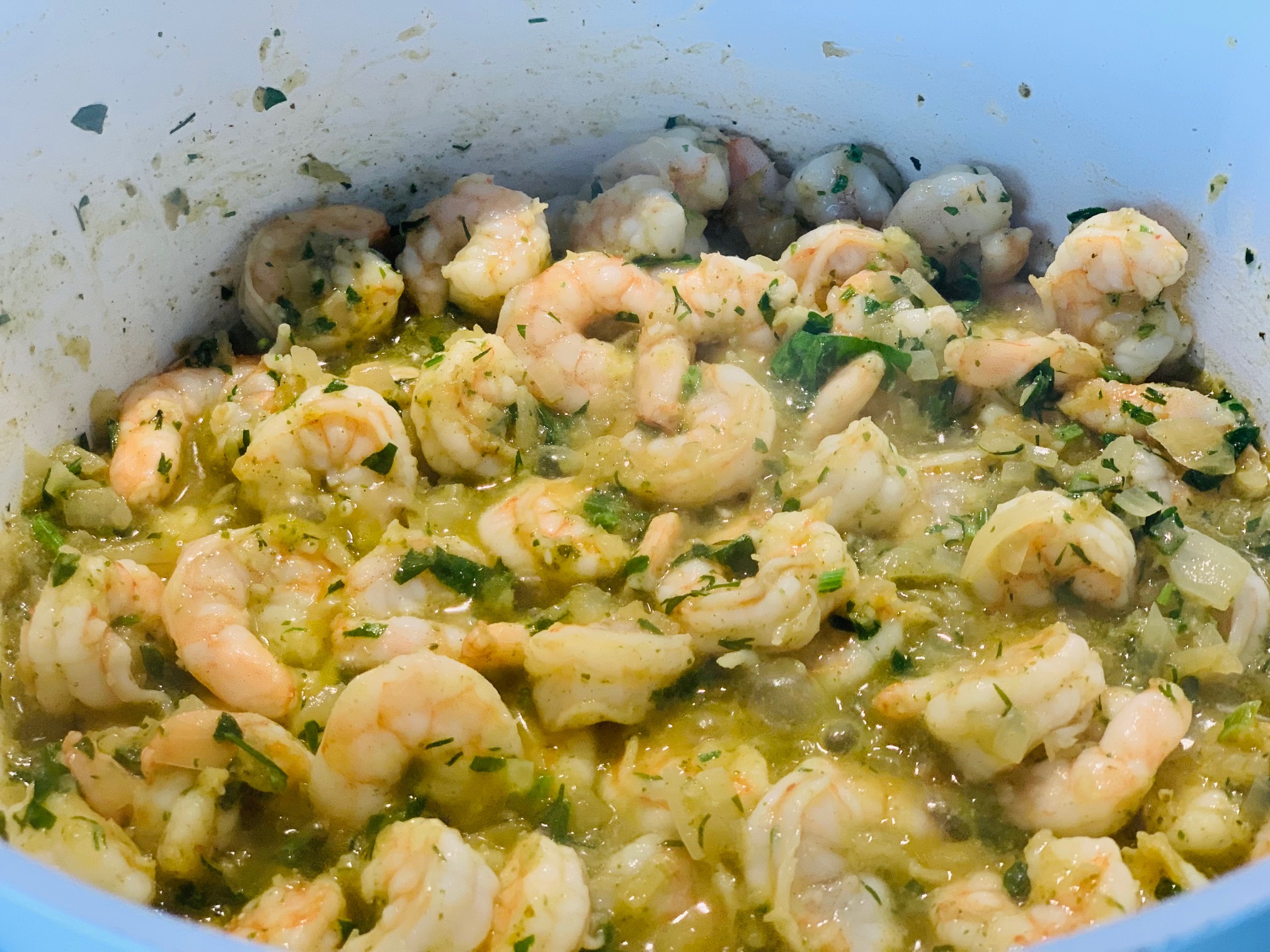 Die etwas aufgetauten Garnelen dazugeben und eine Weile mit anbraten.