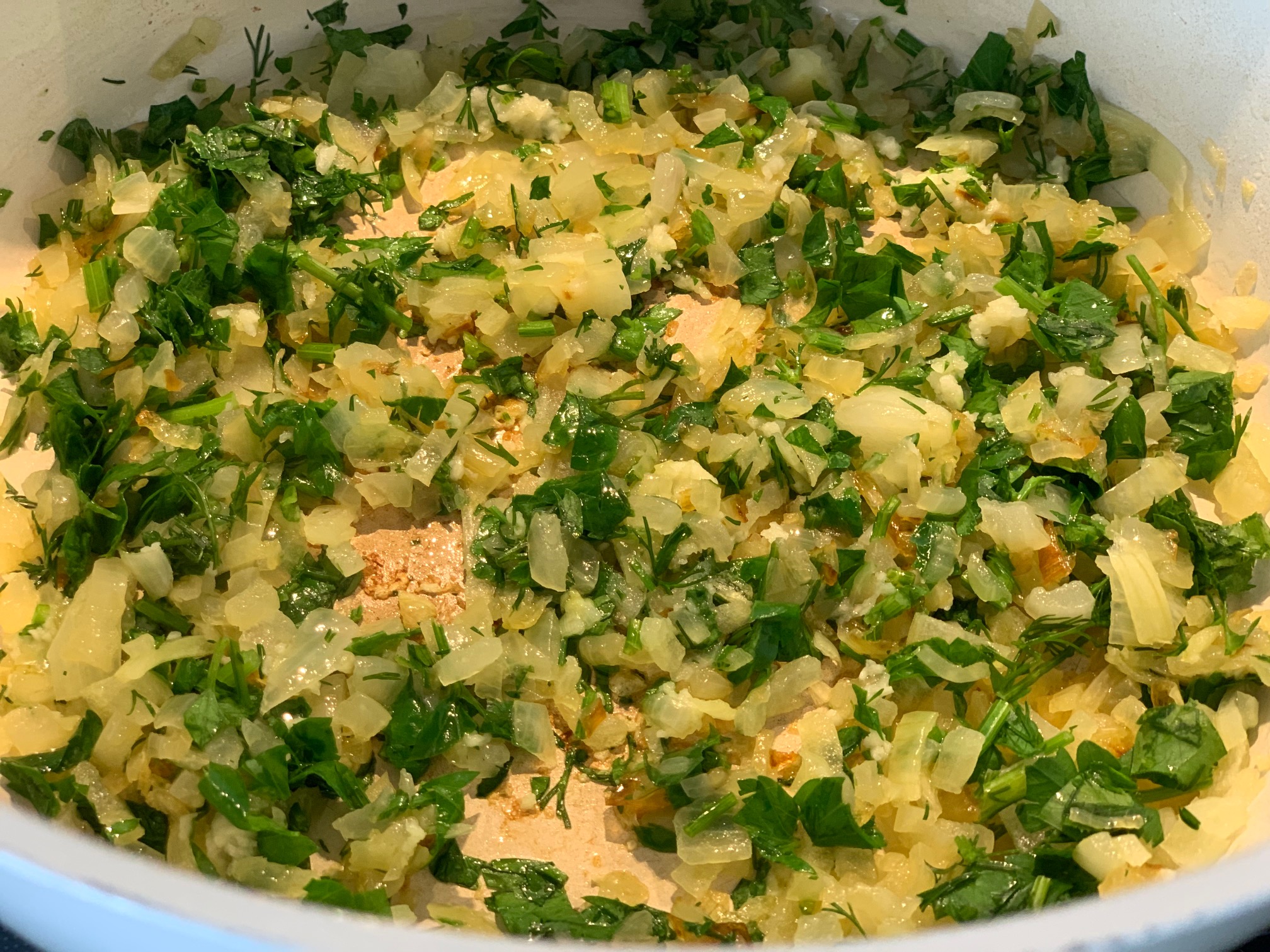 Zwiebel, Petersilie und Dill klein schneiden.