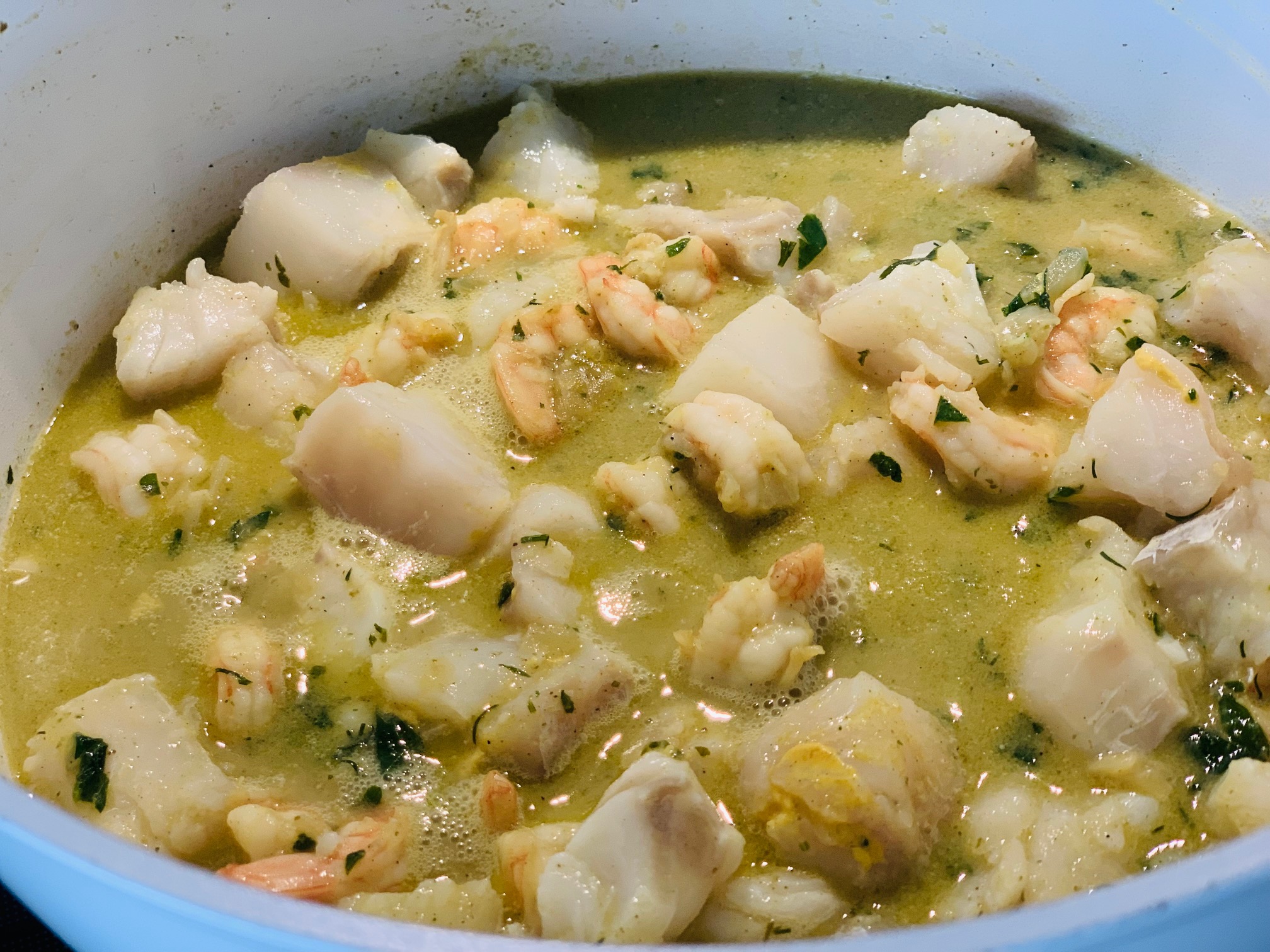 Fisch und heiße Brühe in den Topf geben und bei mittlerer Hitze mit geschlossenem Deckel etwa 15 Minuten köcheln lassen.
