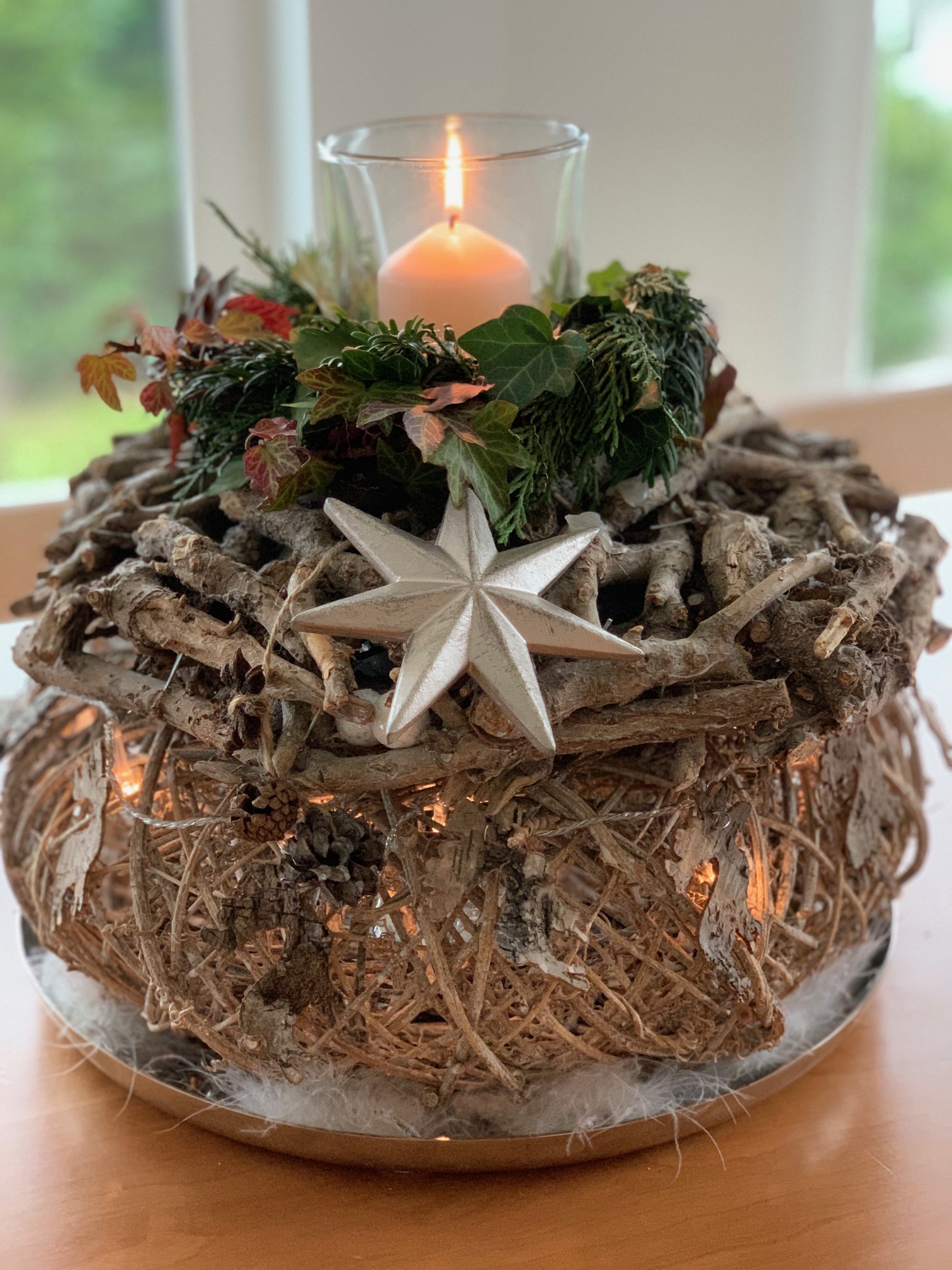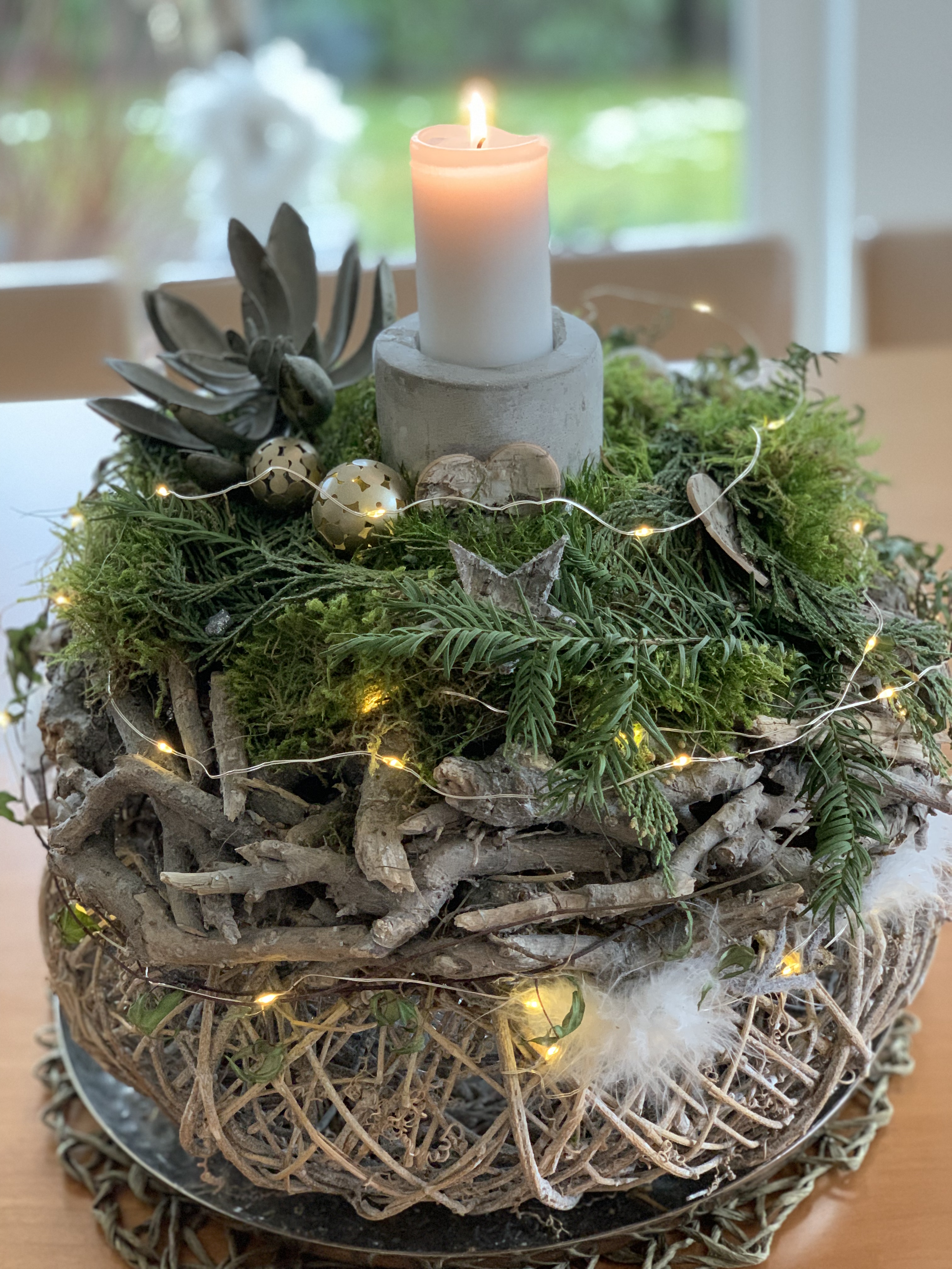 Wenn dieser kleine Kranz oben erst auf einen passenden Teller platziert wird, kann man in die Mitte eine Kerze dazu stellen.