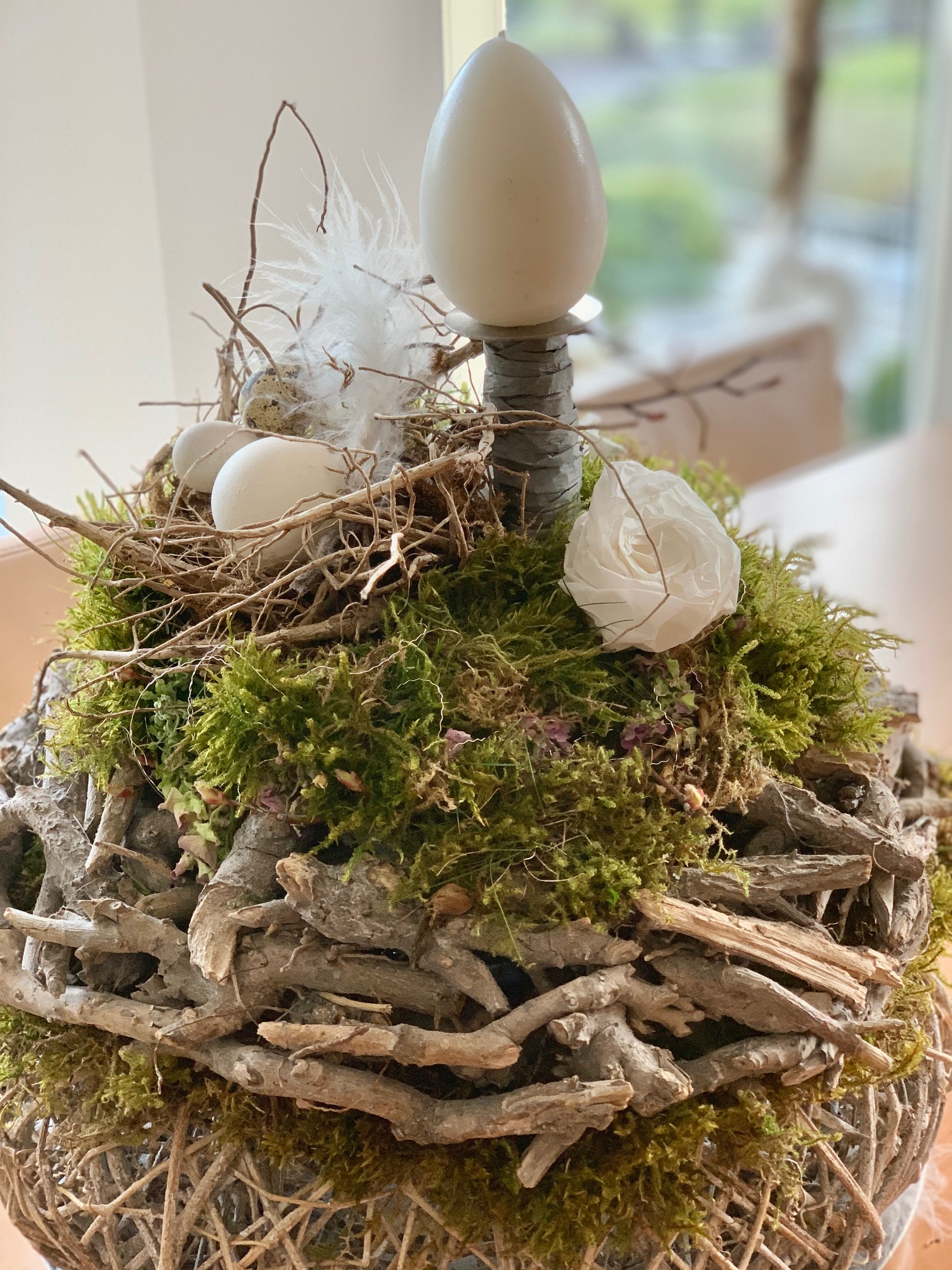 Eine andere Variante für einen Osternkranz ist die mit Moos. Vor allem dann, wenn der Hortensien-Kranz nicht mehr frisch aussieht. Dann einfach Moos in den Kranzturm hinein stecken.