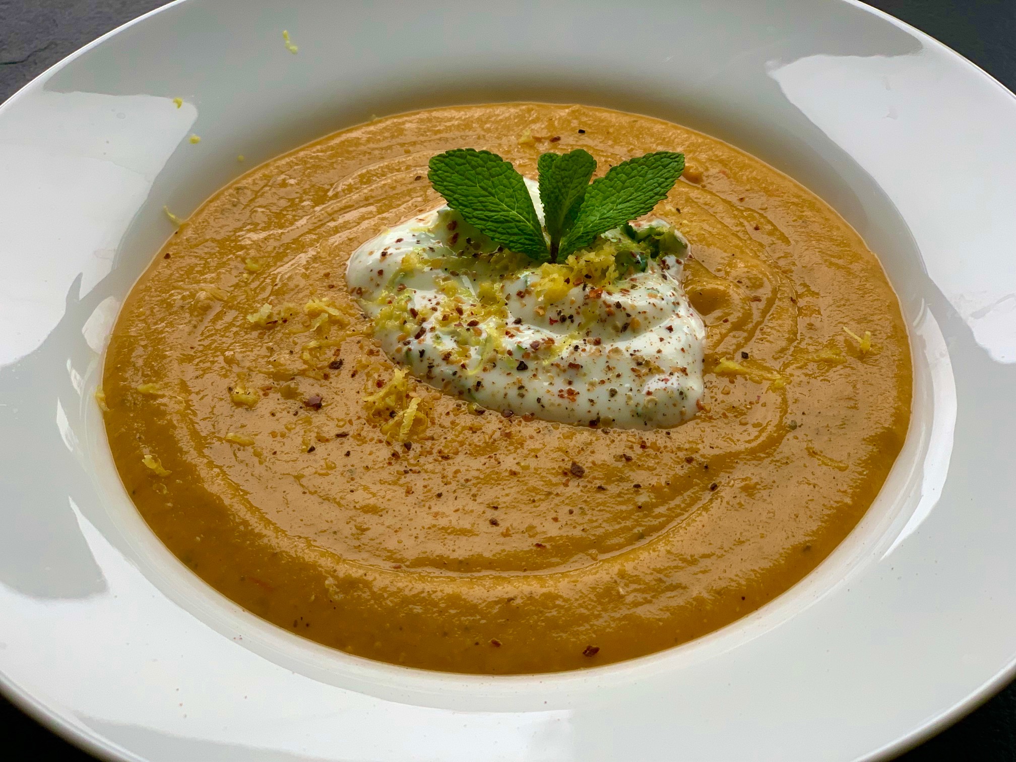 Linsensuppe auf Teller anrichten und mit einem Kleks Joghurt-Minze-Zitrone-Topping servieren.